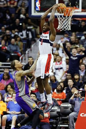 John Wall (foto) marcou 29 pontos e registrou um aproveitamento de 12-15 nos arremessos, incluindo um aproveitamento perfeito de 3-3 da linha de 3 pontos, para ajudar a liderar os Wizards a vencer os Hornets. Wall começou a partida com um aproveitamento de 22,6 % nos arremessos de 3 pontos desde que ele entrou na NBA em 2010, que era o 3º mais baixo aproveitamento da linha de 3 pontos por algum jogador com pelo menos 100 tentativas durante este intervalo, atrás de Andre Miller (aproveitamento de 20,3 %) e DeMar DeRozan (aproveitamento de 22,0 %).